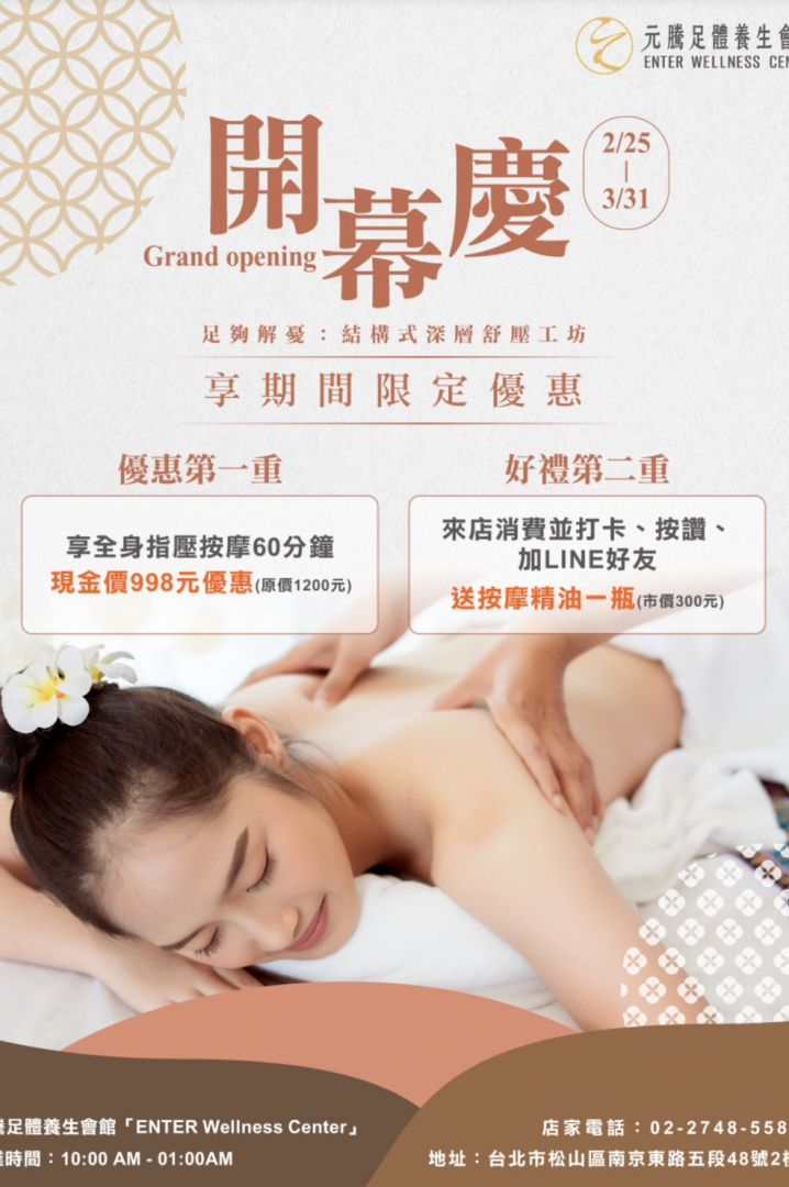 三月底止60分鐘現金價998元,打卡送精油。